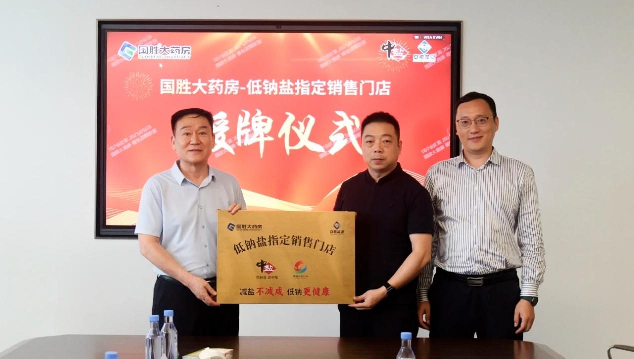 儀式現(xiàn)場(chǎng),雙方圍繞“高鹽飲食危害防控”與“低鈉鹽全民推廣路徑”展開(kāi)深入研討,達(dá)成了“政策同向、使命同頻”的戰(zhàn)略共識(shí),共同致力于將健康干預(yù)覆蓋至家庭單元。隨后,安徽省鹽業(yè)集團(tuán)與國(guó)勝大藥房簽署了戰(zhàn)略合作協(xié)議,安徽省鹽業(yè)集團(tuán)與中鹽東興公司共同向國(guó)勝大藥房授予“中鹽低鈉鹽指定銷(xiāo)售門(mén)店”牌匾,宣告低鈉鹽的健康推廣與銷(xiāo)售在醫(yī)藥渠道正式啟動(dòng)。